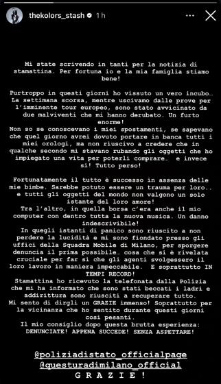 Mi state scrivendo in tanti per la notizia di stamattina. Per fortuna io e la mia famiglia stiamo bene. Purtroppo in questi giorni ho vissuto un vero incubo. La settimana scorsa, mentre uscivano dalle prove per l’imminente tour europeo, sono stato avvicinato da due malviventi che mi hanno derubato. Un furto enorme! Non so se conoscevano i miei spostamenti, se sapevano che quel giorno avrei dovuto portare in banca tutti i miei orologi, ma non riuscivo a credere che in qualche secondo mi stavano rubando gli oggetti che ho impiegato una vita per per poterli comprare, e invece sì! Tutto perso!