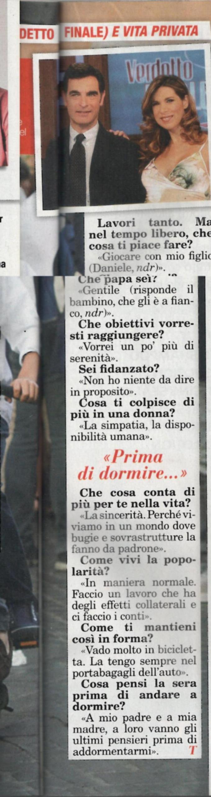 Il conduttore Tiberio Timperi, attualmente a Uno in famiglia, sostituirà Veronica Maya alla guida di Verdetto finale: “Era un programma che avevo già “assaggiato” nel 2012, per cui è stato bello ritornare. Il centro produzione Rai di Napoli è meraviglioso. Il cambio di conduzione in corsa? Sono cose che capitano. Io e Veronica siamo buoni colleghi e sono stato suo ospite allo Zecchino d’oro. Per me Verdetto finale non è assolutamente un programma giuridico, è una trasmissione dove vanno in onda i sentimenti, emozioni e pulsioni, una sorta di seduta psicoanalitica. A Uno in famiglia mi trovo benissimo, è una sorta di seconda casa, allietata dall’arrivo della giovane Francesca Fialdini. Mi piace che parli di attualità e tratti con rispetto argomenti delicati”. Il bel Tiberio è stato fotografato in bici in giro per Roma con suo figlio. Quando gli si chiede che papà è, risponde il figlio Daniele: “Gentile”, mentre lui specifica: “Mi piace giocare con mio figlio”. Quando gli si chiede se è fidanzato, risponde: “Non ho niente da dire in proposito”, ma rivela quali sono le caratteristiche della sua donna ideale: “La simpatia e la disponibilità umana. Per me ciò che più conta nella vita è la sincerità”.