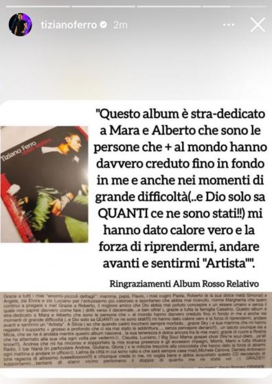 In un’altra storia Instagram il cantautore ha condiviso anche i ringraziamenti pubblici a Mara ed Alberto in uno dei suoi album, Rosso Relativo: