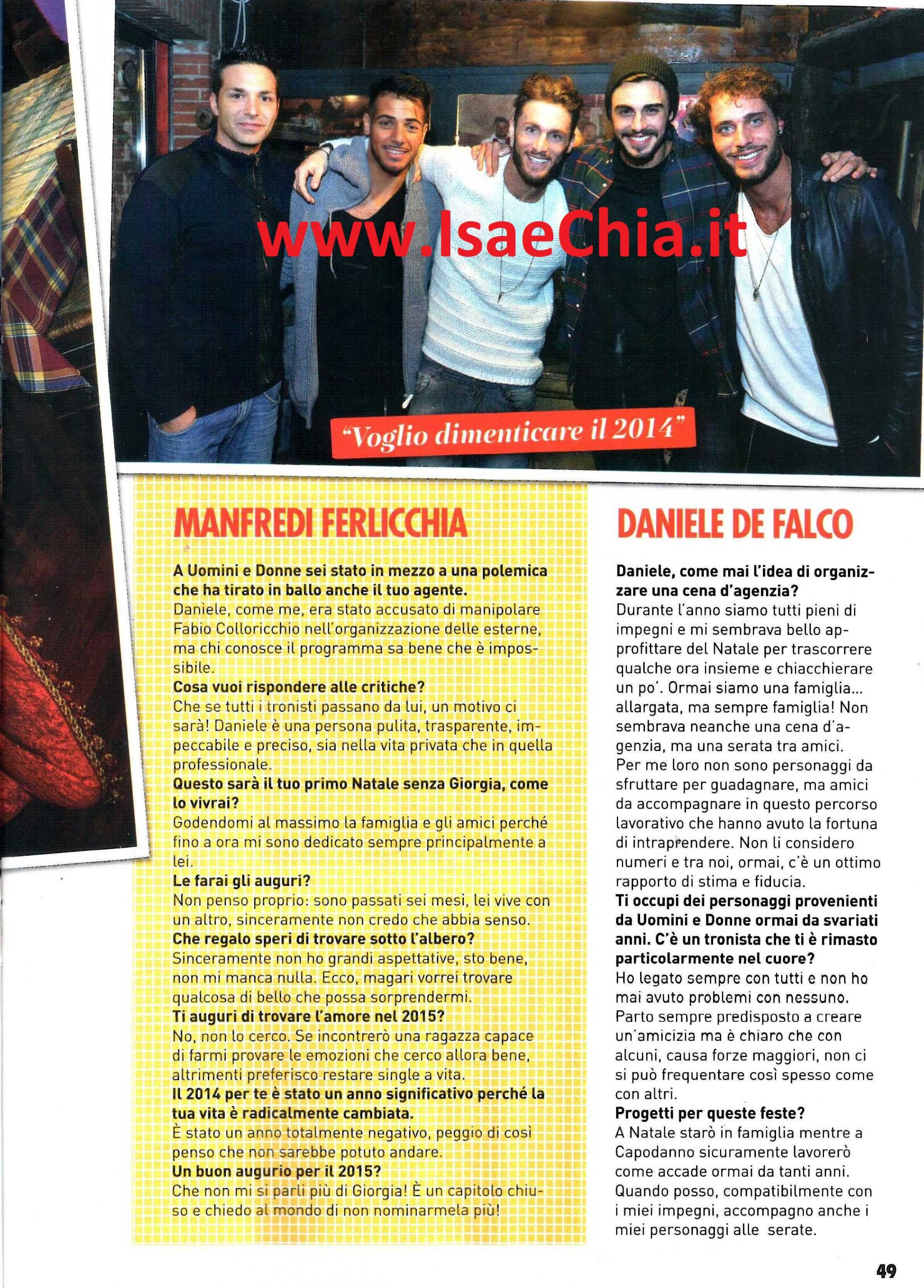 Manfredi, invece, proprio a causa del suo agente Daniele, è stato recentemente al centro di una polemica, in quanto pare che avessero contattato Fabio Colloricchio, corteggiatore di Teresa, per farlo collaborare con l’agenzia: “Daniele era stato accusato, come me, di manipolare Fabio, ma chi segue il programma sa che è impossibile. Se tutti i tronisti passano per Daniele, un motivo ci sarà: è una persona pulita, trasparente, impeccabile e precisa“. Quanto al suo primo Natale senza Giorgia, il modello siciliano commenta: “Mi dedicherò a famiglia ed amici, mentre finora mi sono dedicato sempre principalmente a lei. Non credo che le farò gli auguri: sono passati sei mesi, lei vive con un altro e non credo che abbia senso. Il 2014 è stato un anno completamente negativo, peggio di così credo che non sarebbe potuto andare. Per il 2015 mi auguro che non si parli più di Giorgia: è un capitolo chiuso. Non cerco l’amore, ma se capita una ragazza capace di farmi provare le emozioni che cerco, bene. Altrimenti, preferisco restare single a vita“.