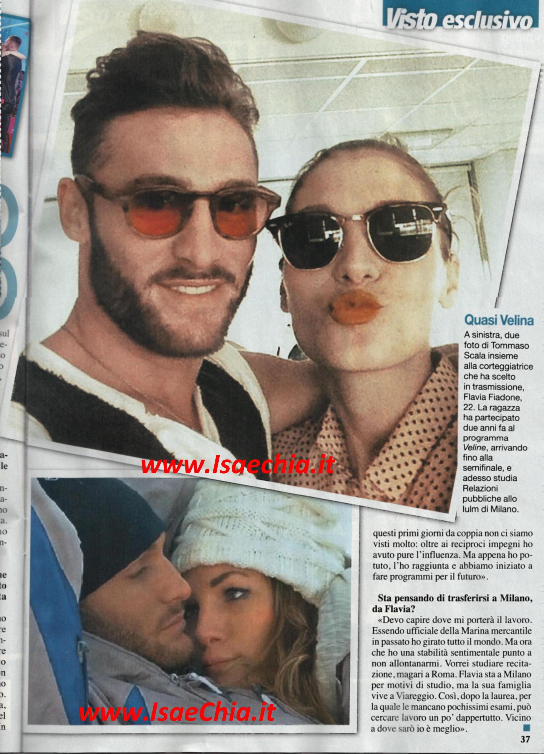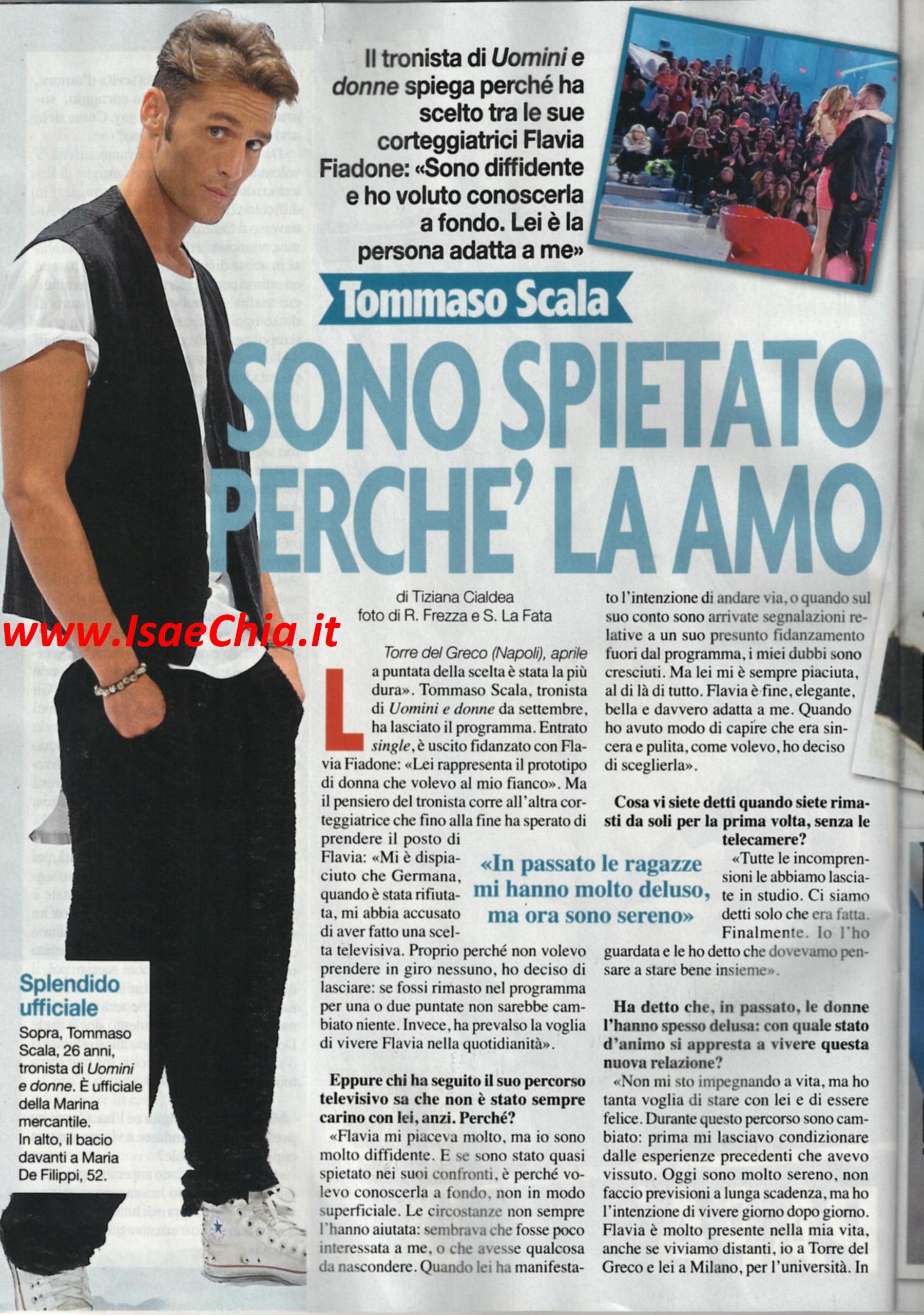 La scorsa settimana a Uomini e donne è andata in onda la scelta di Tommaso Scala, che è ricaduta sulla bella Flavia Fiadone. Adesso l’ex tronista commenta: “La puntata della scelta è stata la più dura. Mi è dispiaciuto che Germana Meli, quando è stata rifiutata, mi abbia accusato di aver fatto una scelta televisiva. Proprio perché non volevo prenderla in giro ho deciso di lasciare: se fossi rimasto altre puntate, non sarebbe cambiato nulla: ha prevalso la voglia di vivere Flavia nella quotidianità. Flavia rappresenta il prototipo di ragazza che volevo al mio fianco: è fine, bella, elegante e adatta a me. Mi piaceva molto, ma sono stato molto diffidente. Se sono stato spietato nei suoi confronti è perché volevo conoscerla a fondo. Quando mi ha manifestato l’intenzione di andare via e quando sono arrivate segnalazioni su un suo presunto fidanzamento, i miei dubbi sono aumentati. Ma quando ho avuto modo di capire che era sincera e pulita, come volevo, mi sono deciso a sceglierla. Dopo la puntata, abbiamo lasciato tutte le incomprensioni in studio. Ci siamo detti che era fatta, finalmente. Io l’ho guardata e le ho detto che dovevamo pensare a stare bene insieme. Non mi sto impegnando a vita, ma ho tanta voglia di stare con lei ed essere felice. Durante questo percorso sono cambiato: prima mi lasciavo condizionare dalle esperienze precedenti che avevo avuto, ora sono sereno. Non faccio piani a lungo termine, vivo giorno dopo giorno. Flavia è molto presente nella mia vita, anche se viviamo molto distanti. In questi primi giorni non ci siamo visti molto: oltre ai reciproci impegni, ho anche avuto l’influenza, ma appena ho potuto, l’ho raggiunta e abbiamo fatto piani per il futuro”. Quando gli si chiede se ha intenzione di trasferire a Milano, dove lui studia, risponde: “Devo capire dove mi porterà il lavoro. Essendo ufficiale della Marina mercantile, in passato ho girato tutto il mondo, ma ora che ho la stabilità sentimentale, non vorrei allontanarmi. Vorrei studiare recitazione a Roma. A Flavia mancano pochissimi esami alla laurea e la sua famiglia vive a Viareggio, così può cercare lavoro un po’ dappertutto. Vicino a dove sarò io è meglio!”