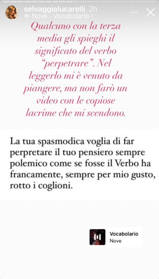 La Lucarelli, successivamente, ha commentato la cosa sul suo profilo senza però fare nomi. “Con quello che si fa il video selfie mentre gli viene l’occhio umido per la Carrà oggi ho visto tutto.”