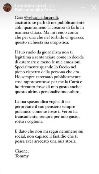 Cara Selvaggia Lucarelli, anzitutto se parli di me pubblicamente abbi quantomeno la creanza di farlo in maniera chiara. Ma mi rendo conto che per una che nel torbido ci sguazza, questa richiesta sia utopistica. Il tuo ruolo da giornalista non ti legittima a sentenziare come io decida di esternare o meno le mie emozioni. Specialmente quando lo faccio nel pieno rispetto della persona che era. Ho sempre esternato pubblicamente cosa rappresentasse per me la Carrà e ho ritenuto fosse di mio gusto anche quest’ultimo personalissimo saluto. La tua spasmodica voglia di far perpetrare il tuo pensiero sempre polemico come se fosse il Verbo ha francamente, sempre per mio gusto, rotto i c******i. E dato che non mi segui nemmeno sui social non capisco il fastidio che ti possa aver arrecato una mia storia. Ciaone, Tommy.