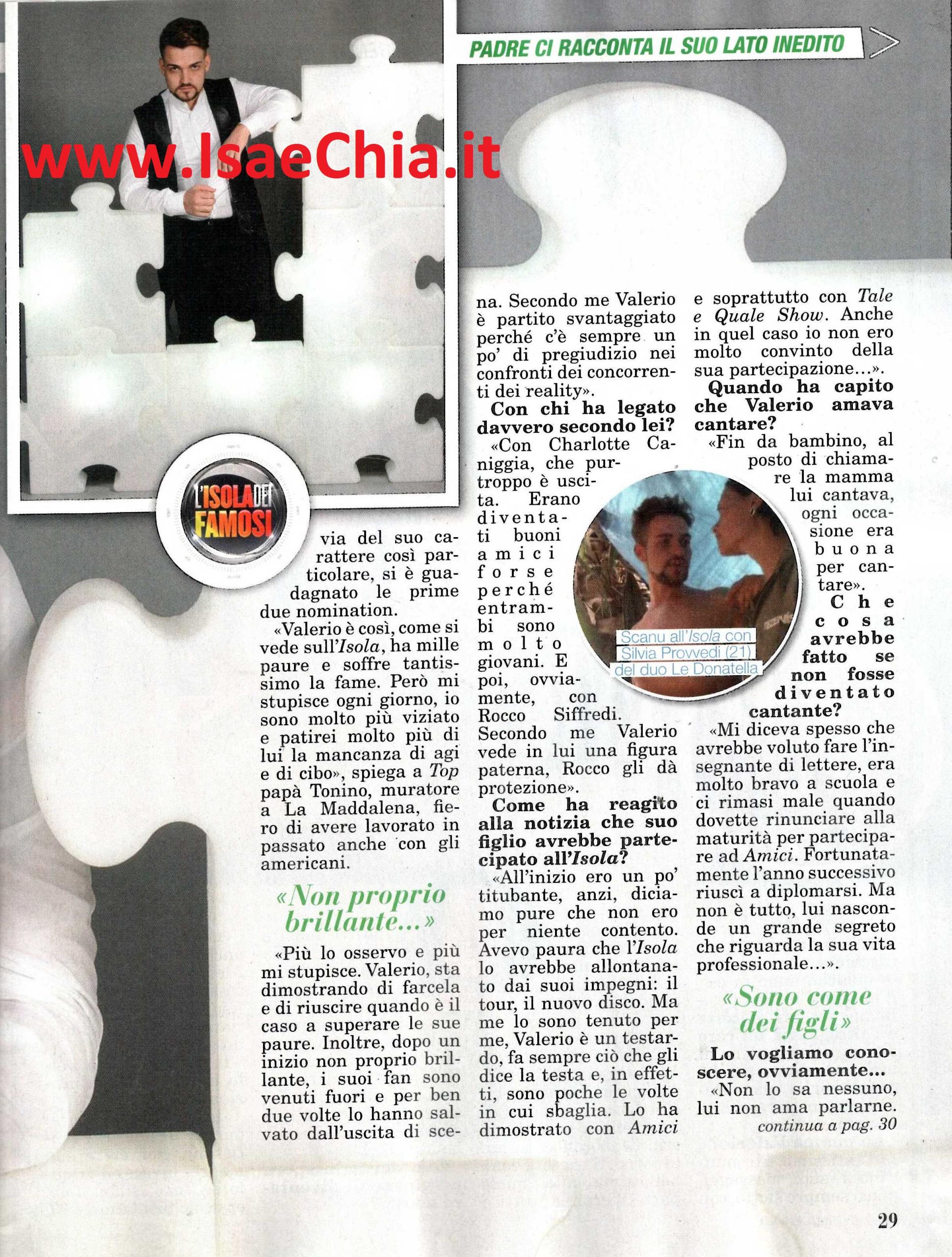 Siamo ormai vicini alla finale de L’Isola dei famosi 10 e, nonostante abbia rischiato di dover lasciare il gioco subito, Valerio Scanu è arrivato quasi alla fine del reality. Un personaggio che o si ama o si odia, noto come cantante, ma con grandi doti anche da imitatore showman, Valerio non ama le mezze parole per esprimere le sue parole e lo ha dimostrato prima ad Amici e ora sull’Isola: “Valerio è così come lo si vede. Ha mille paure e soffre tantissimo la fame. Ma mi stupisce ogni giorno: io sono molto più viziato e patirei molto di più la mancanza di agi e cibo” dice suo padre, il signor Tonino, che fa il muratore sull’isola della Maddalena. “Più lo osservo, più mi stupisce. Sta dimostrando di farcela e di riuscire quando si tratta di superare le sue paure. Inoltre, dopo un inizio non proprio brillante, i suoi fan sono venuti fuori e lo hanno salvato. Secondo me lui è partito svantaggiato perché c’è sempre un po’ di pregiudizi verso i concorrenti di altri reality. Aveva legato molto con Charlotte Caniggia, forse perché erano entrambi molto giovani, ma poi lei è uscita. E poi con Rocco Siffredi: in lui vedeva una figura paterna, che gli dà protezione“. Quando gli si chiede come ha reagito quando ha saputo che Valerio avrebbe partecipato all‘Isola, il signor Tonino risponde: “All’inizio ero un po’ titubante, anzi diciamo per niente contento. Avevo paura che lo avrebbe allontanato dai suoi impegni: l’album, il tour. Ma Valerio è un testardo, fa sempre ciò che gli dice la testa e in effetti sono poche le volte in cui sbaglia. Lo ha dimostrato con Amici e soprattutto con Tale e quale show: anche in quel caso non ero convinto della sua partecipazione. Fin da bambino amava cantare, ogni occasione era quella giusta. Se non fosse diventato cantante, diceva che sarebbe voluto diventare insegnante di lettere. Ci sono rimasto molto male quando per partecipare ad Amici ha dovuto rinunciare alla maturità. Era molto bravo e fortunatamente l’anno dopo è riuscito a diplomarsi. Ma non è tutto: lui nasconde un altro segreto sulla sua vita professionale. Non lo sa nessuno, non ama parlarne, ma Valerio è un ottimo parrucchiere: si è diplomato qualche anno fa, con il massimo dei voti e a Roma, tra un concerto e l’altro, aiuta un amico in un salone di bellezza. Non perché sia mio figlio, ma è bravissimo, un parrucchiere nato. Mi manca tantissimo, mi mancano i suoi messaggi, quasi sempre sfottò, che però è il suo modo per farmi sentire il suo amore. Sicuramente appena tornerà mi chiederà di preparargli una cena a base di costine, capocollo e patate al forno. Sarà una cena bellissima, a cui parteciperanno tutti gli amici e i parenti. E poi mi chiederà dei suoi cagnolini, che per lui sono come dei figli“. A proposito, quando gli si chiede se spera di diventare nonno un giorno, il signor Scanu risponde: “Certo, ma abbiamo anche un altro figlio, Alessandro, che potrebbe darci dei nipoti. Intanto curiamo i cani, che ci danno un gran da fare! Il momento più bello della carriera di Valerio? La vittoria a Sanremo, che desiderava tantissimo. Per me e sua madre, invece, il trionfo a Bravo bravissimo: era solo un bambino“.