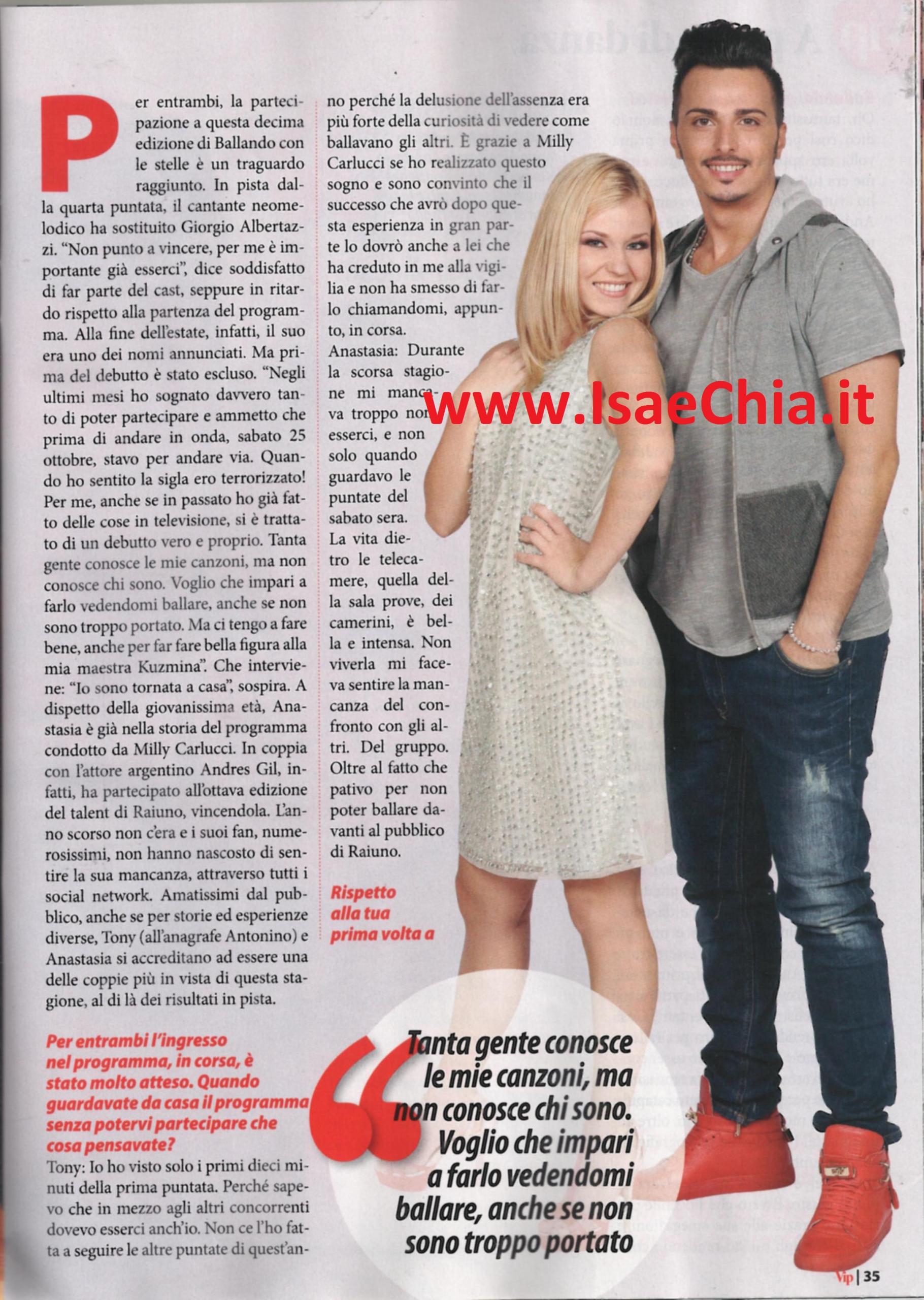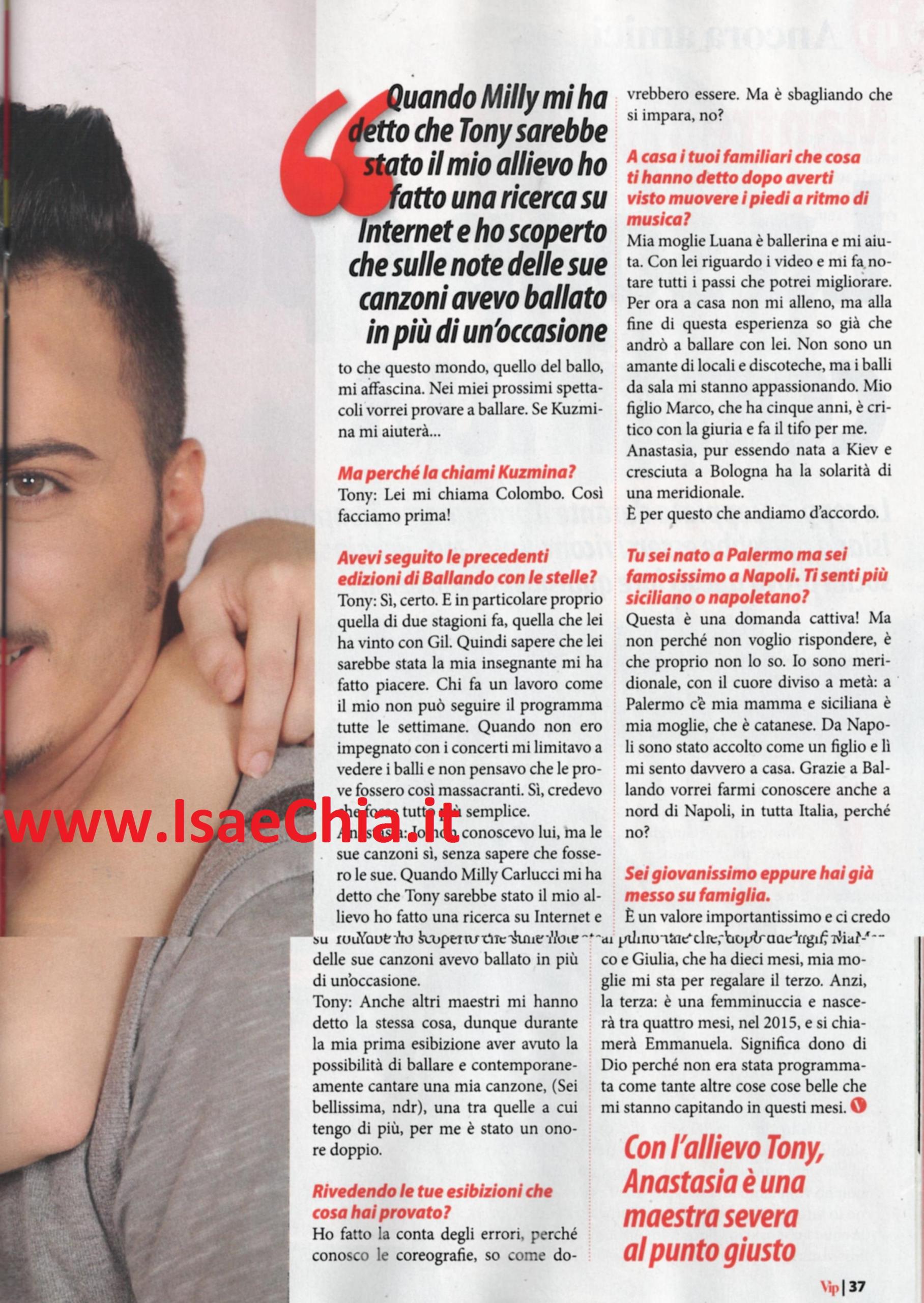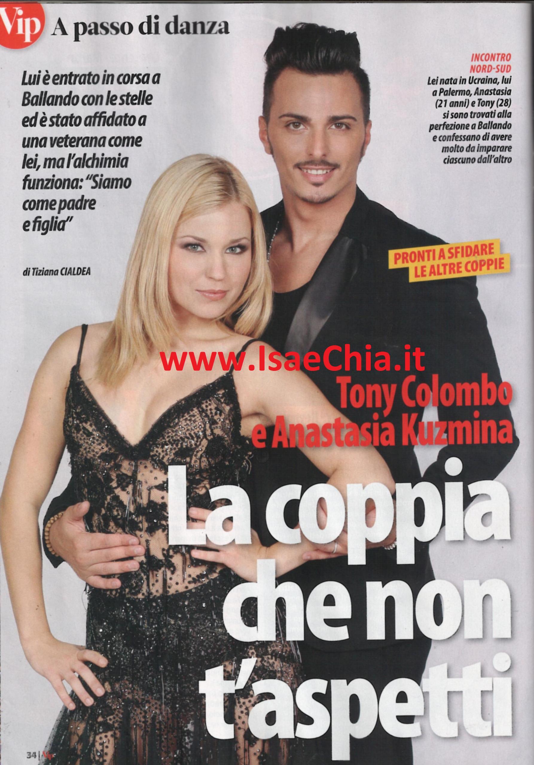 Tra i concorrenti della decima edizione di Ballando con le stelle, il cantante neomelodico napoletano Tony Colombo, in coppia con la maestra di ballo Anastasia Kuzmina, ha sostituito Giorgio Albertazzi, che si è ritirato dalla gara. Tuttavia Tony è stato eliminato nella scorsa puntata. Prima dell’eliminazione, ha raccontato: “Quando ho sentito la sigla la prima volta prima di andare in onda, ero terrorizzato. Ho fatto delle cose in tv in passato, ma per me si tratta di un debutto vero e proprio. La gente mi conosce per le mie canzoni, ma voglio che mi conosca anche per come ballo, anche se non sono molto portato. Voglio fare bella figura anche per la mia maestra Anastasia. All’inizio, quando ero stato escluso dal cast di partenza del programma, non sono riuscito a guardare le prime puntate, perché la delusione per l’assenza era più forte della curiosità. E’ grazie a Milly Carlucci se ho realizzato questo sogno: ha creduto in me e mi ha chiamato in corso”. La Kuzmina, che due edizioni fa vinse in coppia con Andrés Gil, invece, racconta: “La scorsa edizione mi mancava troppo esserci. La vita dietro le telecamere, quella della sala prova, è bella e intensa e non viverla mi faceva sentire la mancanza del confronto con gli altri, oltre al fatto che pativo il fatto di non poter ballare davanti al pubblico di Raiuno. Rispetto alla mia prima volta nel programma sono cambiata tantissimo: ero appena maggiorenne, e legai tanto con Andrés, che era spaesato come me. Ci sentiamo ancora: anche dopo Pechino Express siamo sempre buoni amici, anche se stiamo facendo nuove esperienze. Sono cresciuta umanamente e professionalmente: ho preso la patente, comprato una macchina, mi sono trasferita da Bologna a Roma e ho debuttato come attrice di teatro. Continuerò a ballare, ma non mi dispiacerebbe fare l’attrice. Il mio sogno è il musical: sto prendendo lezioni di canto e magari potrei chiedere consiglio a Tony! Lui è molto tranquillo e simpatico, mi tratta più da figlia, essendo lui già padre, che da maestra. Si impegna tanto e non mi dà motivo di essere severa, ma cerca di prendermi in giro per allentare il ritmo degli allenamenti!”. Lui risponde: “Lei è bravissima e severa al punto giusto. Io ho mille curiosità e grazie alle sue spiegazioni mi sto rendendo conto che questo mondo mi affascina. Avevo seguito in particolare l’edizione in cui ha vinto con Gil e mi ha fatto piacere sapere che sarebbe stata la mia maestra”. Lei, invece, rivela: “Io non sapevo chi fosse, ma quando ho cercato delle sue canzoni su Youtube, ho scoperto di averle ballate in più di un’occasione”. “Anche altri concorrenti hanno detto lo stesso; dunque durante la mia prima esibizione aver avuto l’occasione di ballare e cantare contemporaneamente una mia canzone, Sei bellissima, è stato un onore doppio. Ho riguardato le esibizioni e ho contato gli errori; mia moglie Luana è ballerina e mi aiuta, mi dice dove potrei migliorare. Alla fine di quest’esperienza, andrò a ballare con lei” dice lui, nonostante, in realtà, lo aspetti un impegno ben più grande: “Mia moglie sta per regalarmi la terza figlia: nascerà nel 2015 e si chiamerà Emmanuela, dono di Dio, come tutte le cose belle che mi stanno capitando”.