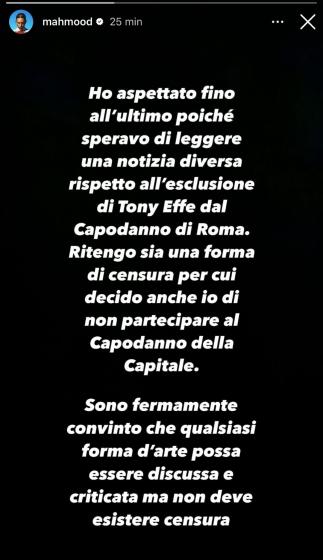 Ho aspettato fino all’ultimo poiché speravo di leggere una notizia diversa rispetto all’esclusione di Tony Effe dal Capodanno di Roma. Ritengo sia una forma di censura per cui decido anche io di non partecipare al Capodanno della Capitale. Sono fermamente convinto che qualsiasi forma d’arte possa essere discussa e criticata, ma non deve esistere censura.