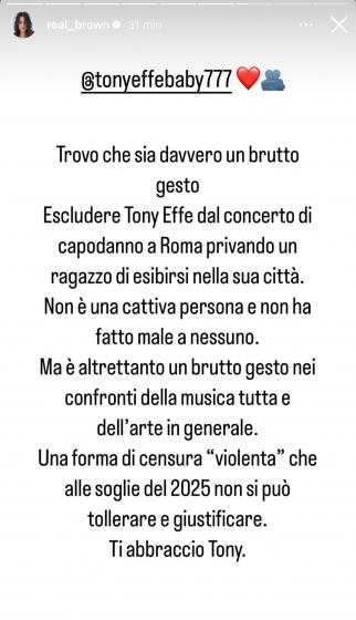 Trovo che sia davvero un brutto gesto escludere Tony Effe al concerto di Capodanno a Roma, privando un ragazzo di esibirsi nella sua città. Non è una cattiva persona e non ha fatto male a nessuno Ma è altrettanto brutto nei confronti della musica tutta e dell’arte in generale. Una forma di censura violenta che alle soglie del 2025 non si può tollerare e giustificare. Ti abbraccio Tony.