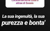 Io non credo alla storia che Sossio ha con Ursula Bennardo. Uscito dall’isola di Temptation ha cominciato a mettermi cuoricini sulle bacheche di Facebook pubblicamente. Fino a poco tempo fa mi scriveva perché gradiva la mia presenza nel programma e che io lo andassi a corteggiare, mentre si spacciava innamorato perso per questa Ursula! Quindi mentre piangeva in trasmissione per una donna scrive e chiede a un’altra di andarlo a corteggiare! Queste sono cose che non mi piacciono. Io penso abbia un copione tra le mani e quindi ha trovato la donna che gli ha concesso di fare il copione. Anche all’epoca con me voleva un figlio con gli occhi azzurri, mi ha regalato un carillon al compleanno, quindi stesso copione rivolto ad un’altra donna. Nel programma ti lasciano libero di essere te stesso a pieno, sta alla persona decidere se voler diventare ridicola oppure no, se avere una dignità che penso sia tra le cose più importanti nella vita.
