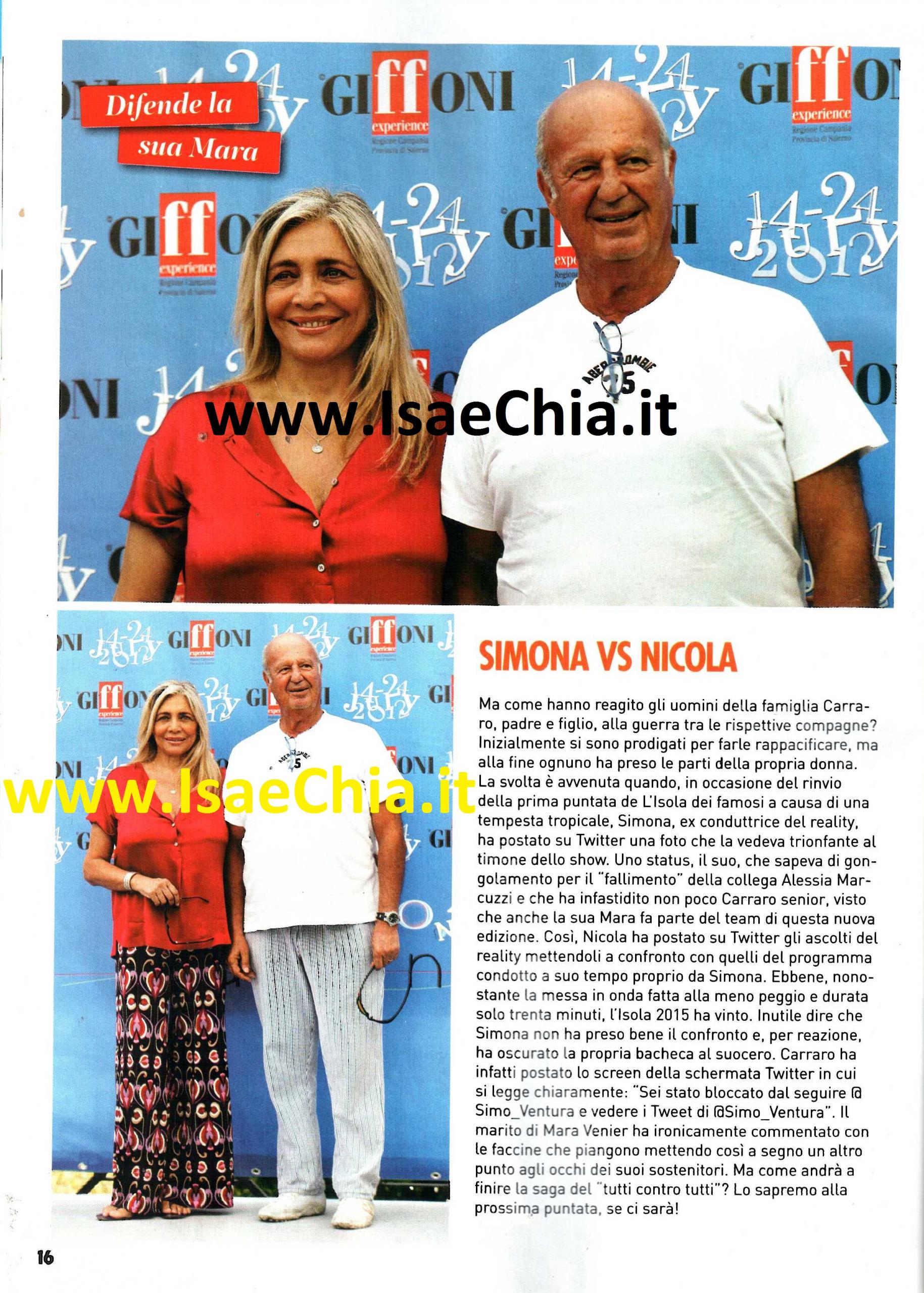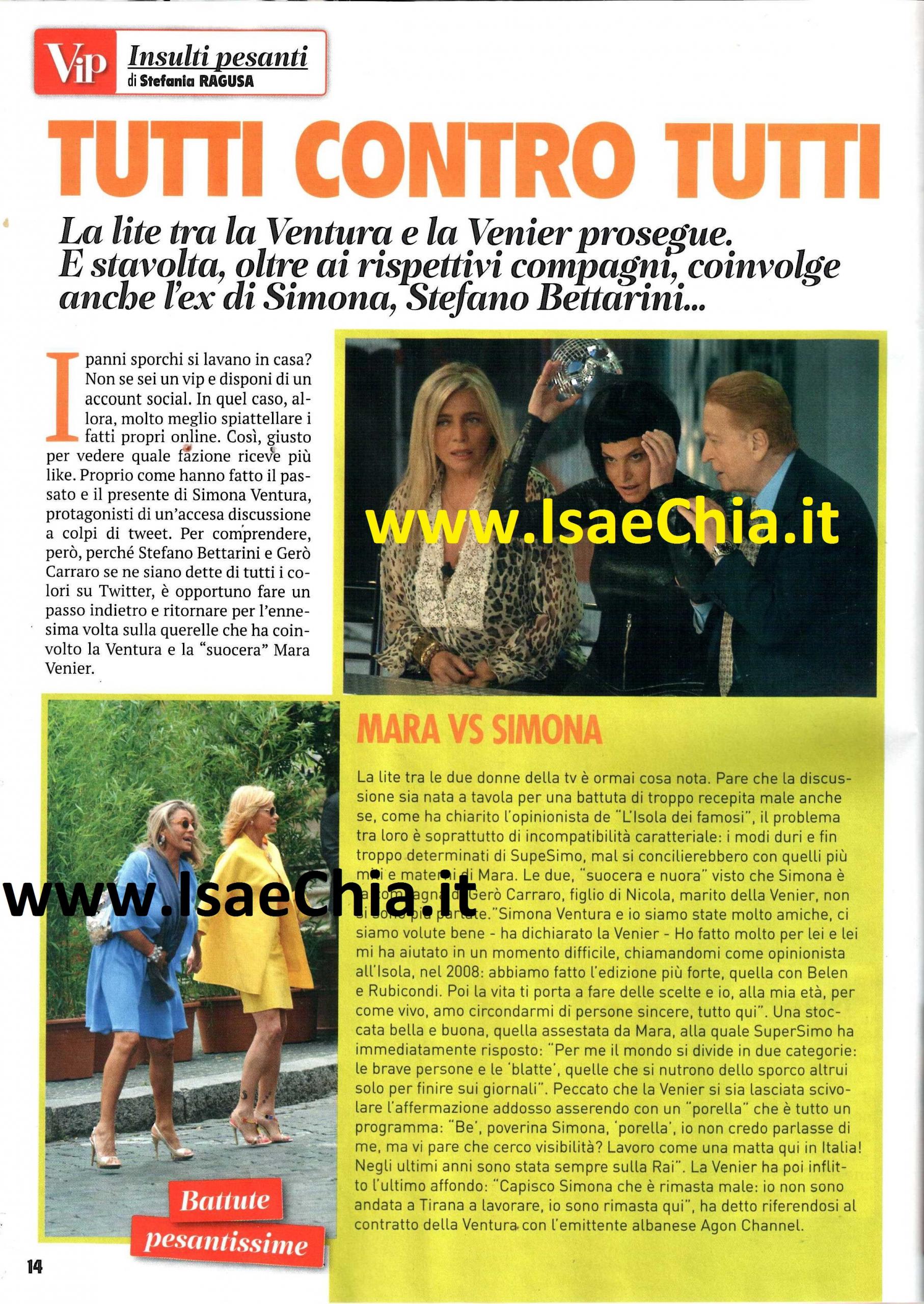 La lite tra due prime donne della tv, Mara Venier e Simona Ventura, è ormai cosa nota: le due sono le compagne di vita di padre e figlio, Nicola e Gerò Carraro, ma la loro incompatibilità caratteriale non consente loro di viversi questa pseudo-parentela. “Simona e io eravamo molto amiche. Mi ha chiamato in un momento di difficoltà, chiamandomi come opinionista all’Isola dei famosi nel 2008: abbiamo fatto l’edizione più forte, quella con Belén Rodriguez e Rossano Rubicondi. Poi la vita ti porta a fare delle scelte e io, alla mia età, per come vivo, preferisco circondarmi di persone vere“, ha detto la Venier. SuperSimo, invece, ha ribattuto: “Per me il mondo si divide in due categorie: le brave persone e le ‘blatte’, quelle che si nutrono dello sporco altrui per finire sui giornali“. A tali dichiarazioni, l’opinionista dell’Isola ha risposto: “Be’, Simona, porella, io non credo parlasse di me, ma vi pare che cerco visibilità? Lavoro come una matta qua in Italia! Io capisco Simona, che ci è rimasta male: io non sono andata a Tirana a lavorare, io sono rimasta qui” ha aggiunto in riferimento al fatto che la Ventura sia passata sulla nuova rete con sede in Albania. Adesso, il secondo round di quest’epopea. Stefano Bettarini, il calciatore ex marito della Ventura e Gerò Carraro, il suo attuale compagno, se ne sono dette di tutti i colori su Twitter: “Io sto con Mara, viva MARA!” ha scritto Bettarini, suscitando le ire di Gerò: “Dici solo ca…“. Chiaramente, il vincitore di Jump ha risposto: “Sei un anonimo fallito mantenuto dai genitori“. Da allora, il profilo Twitter di Gerò è sparito. E non è finita qui. In occasione della prima puntata dell’Isola dei famosi 10, per la prima volta su Mediaset condotta da Alessia Marcuzzi, a causa delle condizioni climatiche avverse, il reality non ha potuto avere inizio. Quella stessa sera, Simona ha postato una sua foto trionfante. Uno status, il suo, che ha innervosito Carraro senior, perché sua moglie Mara è nel cast del programma come opinionista. Ebbene, l’Isola ha vinto. Inutile dire che Simona ha dovuto accusare il colpo e ha oscurato la propria bacheca al suocero. “Sei stato bloccato dal seguire @Simo_Ventura e vedere i tweet di @Simo_Ventura” è la scrittura che si è ritrovato di fronte, che lui ha ironicamente commentato con delle faccine che piangono.
