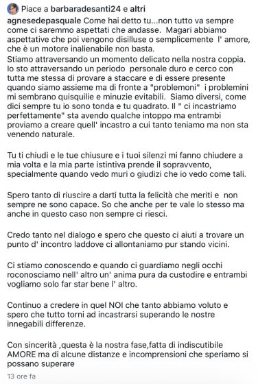 Nelle ultime ore, però, qualcosa è cambiato e Agnese ha voluto condividere con i suoi follower il momento difficile che sta attraverso con Roberto e che li ha portati a vivere una crisi: