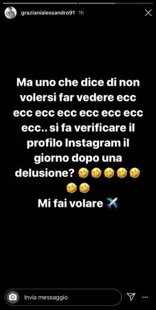 Proprio qualche ora fa attraverso una pungente Instagram Story, Alessandro Graziani – ex corteggiatore che Giovanna ha eliminato ad un passo dalla scelta – ha lanciato una bella stoccata a Davide Basolo, asserendo: “Ma uno che dice di non volersi far vedere ecc. ecc., si fa verificare il profilo Instagram il giorno dopo una delusione? Mi fai volare”.