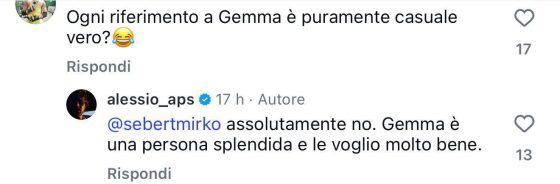 Tra i commenti c’è stato chi ha ipotizzato che le sue parole potessero essere indirizzate a Gemma Galgani, protagonista di un acceso scontro con Barbara de Santi, ma Alessio ha negato: “assolutamente no. Gemma è una persona splendida e le voglio molto bene”.
