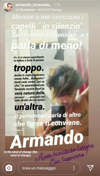 ‘Mentre a me crescono i capelli ‘in silenzio’, tu smontati l’extension e parla di meno!‘ ha incalzato Armando ed ha continuato: