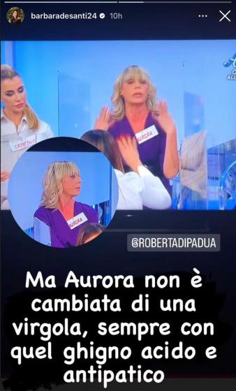 L’ex dama di Uomini e Donne in una storia su Instagram ha scritto un commento al vetriolo contro Aurora, taggando proprio la Di Padua: