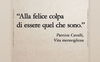 Dapprima ha preso in prestito le parole della canzone di Jovanotti: “Mormora la gente mormora, falla tacere praticando l’allegria“; e poi un’altra citazione che recita “Alla felice colpa di essere quel che sono“: