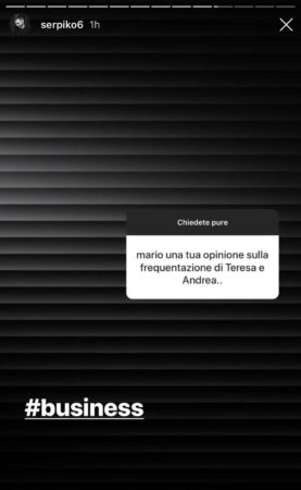 Ma andiamo con ordine: l’ex corteggiatore di Claudio Sona, ormai da qualche tempo ospite fisso di Uomini e Donne, quest’oggi ha deciso di dedicare qualche momento del suo tempo libero ai suoi numerosi followers, rispondendo ad alcune loro curiosità. Una delle prima domande rivolte a Mario è stata quella che aveva ad oggetto proprio la nuova frequentazione del trentenne veneto con l’ex tronista Teresa Langella, ufficializzata nel corso dell’ultima registrazione del Trono Classico (ve ne abbiamo parlato QUI). Serpa, che non ama molto i giri di parole, senza mezzi termini ha sentenziato: #business.
