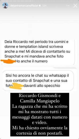 Nel corso dei mesi la stessa ex corteggiatrice l’aveva fatto intendere in alcune sue storie su Instagram. Nella giornata di ieri poi Deianira Marzano ha pubblicato alcune segnalazioni arrivate in direct. Sembrerebbe infatti che Riccardo adesso frequenti la donna con cui avrebbe tradito Camilla.