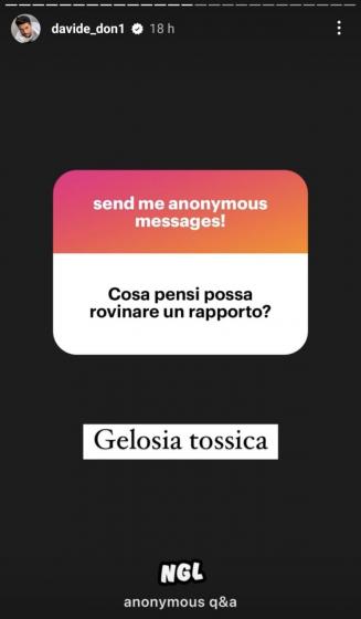 Se i rumor attorno alla vicenda si moltiplicano di giorno in giorno, a non volerne parlare sembrano essere i due che, però, si “ammorbidiscono” ogni volta che qualcuno pone loro domande più mirate. Nelle ultime ore, in particolare, proprio all’ex tronista di Uomini e Donne è stato chiesto su Instagram “Cosa pensi possa rovinare un rapporto?“. “Gelosia tossica“, ha scritto Davide. E da lì pioggia di ipotesi, insinuazioni e tant’altro ancora.