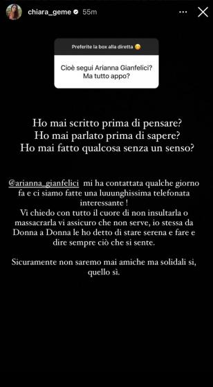 Ho mai scritto prima di pensare? Ho mai parlato prima di sapere? Ho mai fatto qualcosa senza un senso? Arianna Gianfelici mi ha contattata qualche giorno fa e ci siamo fatte una lunghissima telefonata interessante! Vi chiedo con tutto il cuore di non insultarla o massacrarla. Vi assicuro che non serve. Io stessa da donna a donna le ho detto di stare serena e fare e dire sempre ciò che si sente. Sicuramente non saremo mai amiche, ma solidali sì, quello sì.
