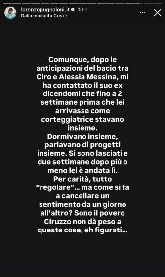 Comunque, dopo le anticipazioni del bacio tra Ciro e Alessia Messina, mi ha contattato il suo ex dicendomi che fino a 2 settimane prima che lei arrivasse come corteggiatrice stavano insieme. Dormivano insieme, parlavano di progetti insieme. Si sono lasciati e due settimane dopo più o meno lei è andata lì. Per carità, tutto “regolare”… ma come si fa a cancellare un sentimento da un giorno all’altro? Solo il povero Ciruzzo non dà peso a queste cose, eh figurati…