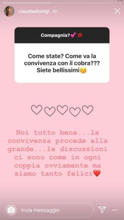 Dividere gli stessi spazi e la stessa quotidianità non è facile ma, come ha raccontato l’ex corteggiatrice ai suoi followers, per adesso nonostante qualche incomprensione tutto procede a meraviglia: