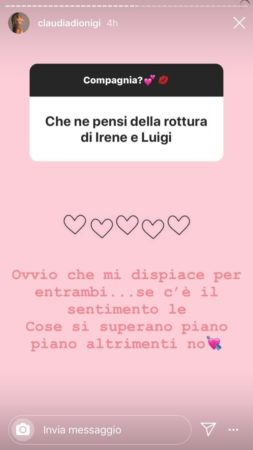 Se, però, a Lorenzo e Claudia le cose stanno andando per il meglio, non si può dire lo stesso per Irene Capuano e Luigi Mastroianni, che dopo un periodo di silenzio e lontananza hanno annunciato la rottura a mezzo social, anche se la Capuano a quanto pare non smette di credere in un possibile ritorno di fiamma con l’ex tronista (QUI le sue parole in radio). Dello stesso avviso sembra essere anche la Dionigi che, interrogata dai suoi fan sull’argomento, ha specificato che se c’è il sentimento si riesce a superare tutto il resto: