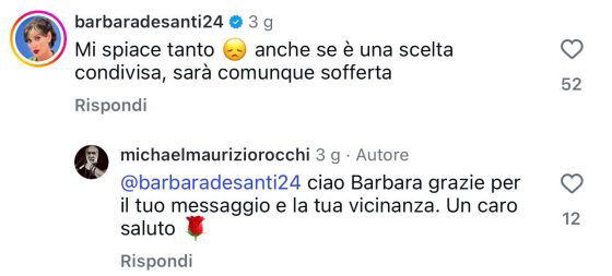 La rottura è stata commentata da molti con dispiacere e tra i vari messaggi comparsi sotto il post dell’ex cavaliere ce ne sono stati alcuni provenienti dai partecipanti del programma, come Barbara De Santi che ha scritto: “Mi spiace tanto anche se è una scelta condivisa, sarà comunque sofferta”.
