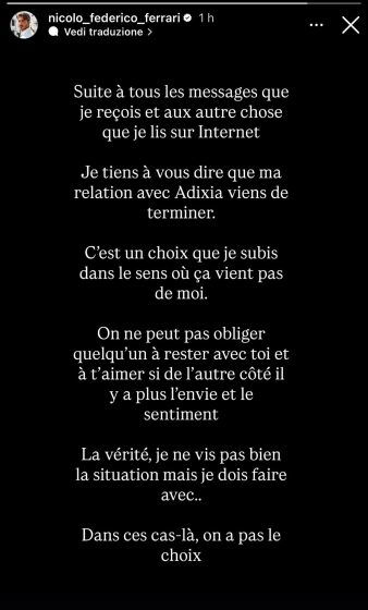 Nicolò, infatti, ha spiegato di aver posto fine alla sua storia con Adixia, spiegando che dall’altra parte c’era più invidia che amore: