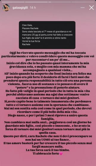Gaia ha voluto parlare della sua storia dopo essere rimasta molto colpita da un messaggio arrivato in direct da parte di un’utente. La donna, prossima al parto, è stata lasciata dal compagno al settimo mese di gravidanza e aveva chiesto all’ex volto di Uomini e Donne, mamma single, come aveva fatto a crescere suo figlio da sola.