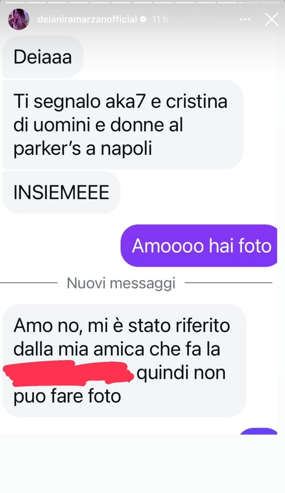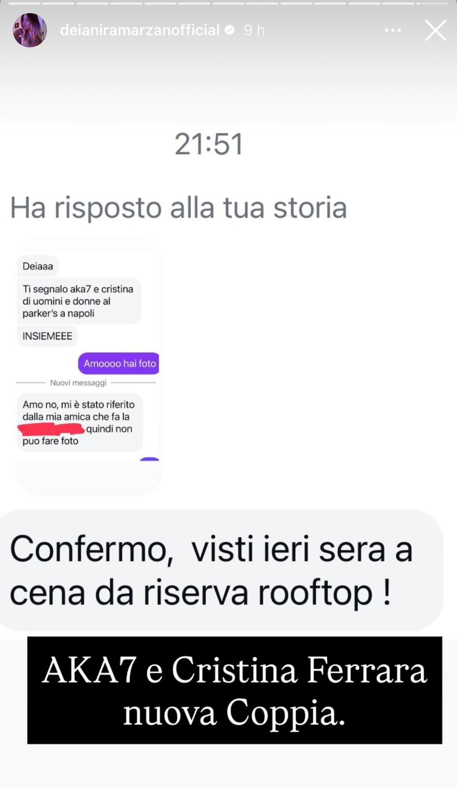 I due sono stati avvistati insieme a Napoli in un ristorante: “Ti segnalo Aka7 e Cristina di Uomini e Donne al Parker’s a Napoli”. Lui inoltre le avrebbe anche fatto trovare una rosa al tavolo: