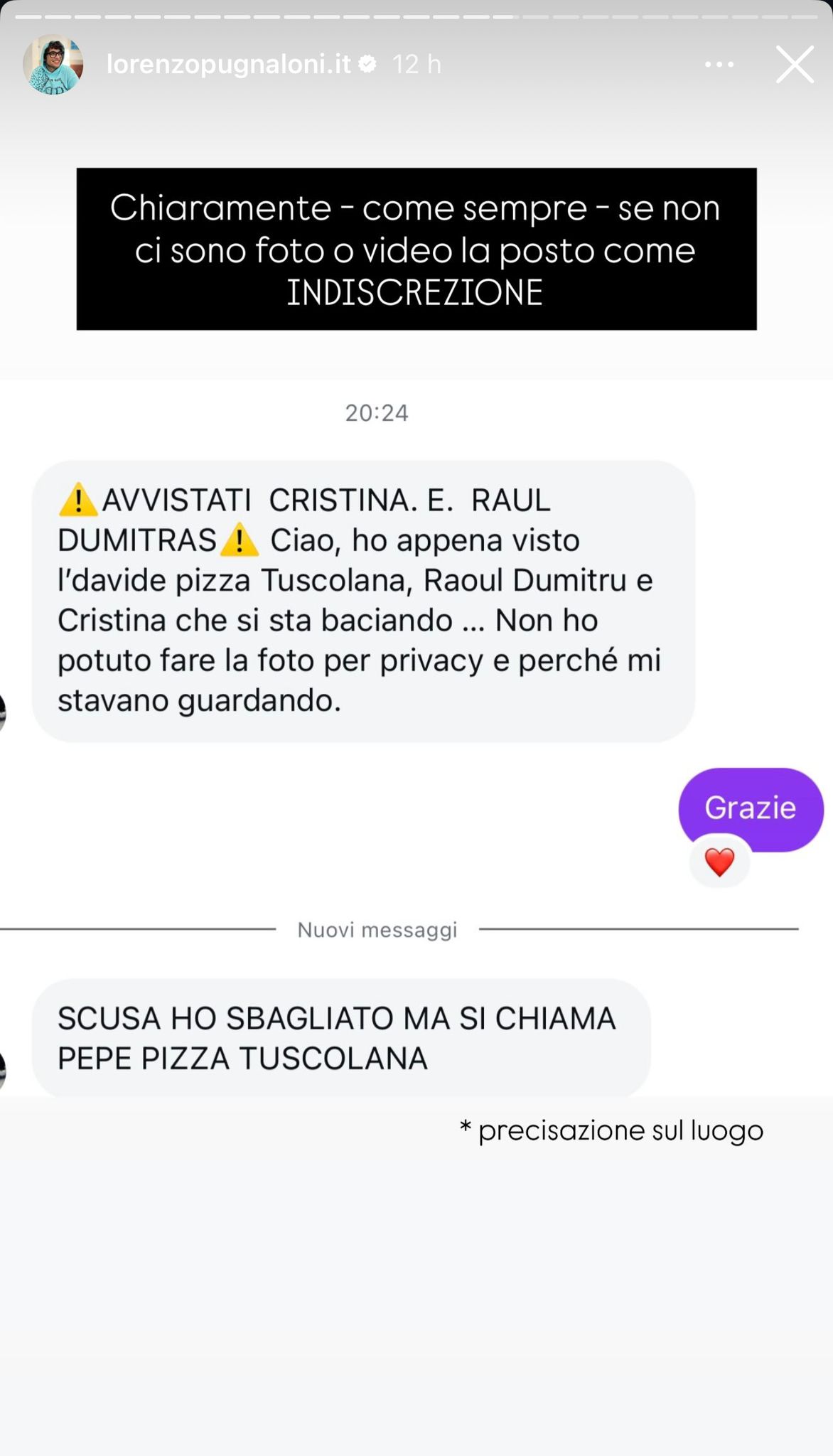 Ciao, ho appena visto Raul Dumitras e Cristina Ferrara che si baciavano. Non ho potuto fare la foto per privacy e perchè mi stavano guardando. Il ristorante si chiama Pepe Pizza Tuscolana.