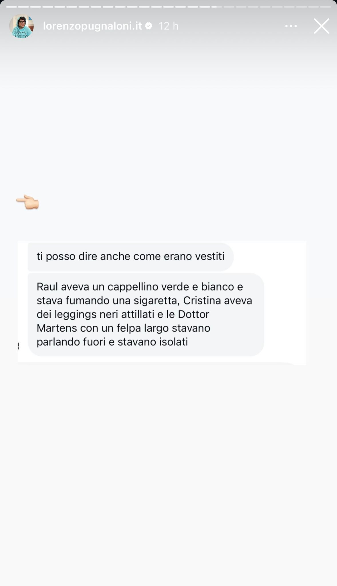 Ti posso dire anche come erano vestiti: Raul aveva un cappellino verde e bianco e stava fumando una sigaretta, Cristina aveva dei leggings neri attillati e le Dottor Martens con un felpa largo stavano parlando fuori e stavano isolati.