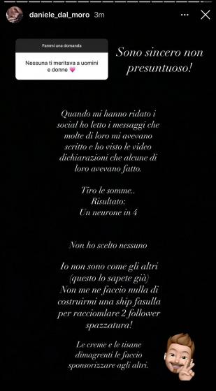 A qualche mese di distanza da quella (non) scelta, Daniele su Instagram ne ha spiegato il motivo, non risparmiando delle affermazioni decisamente forti nei confronti delle sue ex corteggiatrici: “Quando mi hanno ridato i social ho letto i messaggi che molte di loro mi avevano scritto e ho visto le video-dichiarazioni che alcune di loro avevano fatto. Tiro le somme.. Risultato: un neurone in 4. Non ho scelto nessuno. Io non sono come gli altri (questo lo sapete già). Non me ne faccio nulla di costruirmi una ship fasulla per racimolare 2 follower spazzatura! Le creme e le tisane dimagranti le faccio sponsorizzare agli altri”.