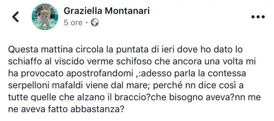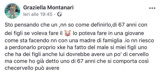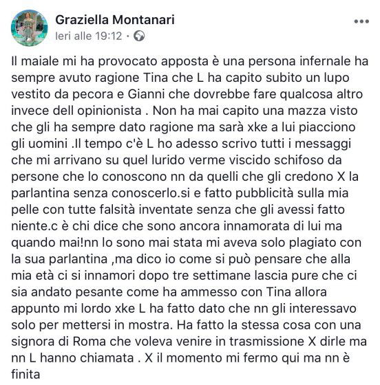 Il Bazzanella ha mantenuto un aplomb davvero invidiabile, a differenza di Graziella che si è lasciata andare a uno sfogo degno di nota, proseguito anche sul proprio profilo Facebook: