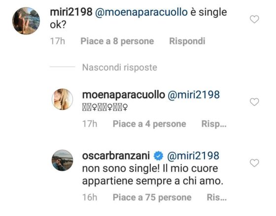 Tuttavia, è innegabile che ci siano delle incomprensioni che non sono sfuggite a chi li segue ogni giorno, che vi abbiamo segnalato anche in QUESTO post. La ragazza è temporaneamente lontana dal capoluogo campano per godersi qualche giorno con la sua famiglia e i suoi amici, e quindi dal suo Oscar, che qualche giorno fa ha risposto così a chi gli ha chiesto se fosse ritornato single: