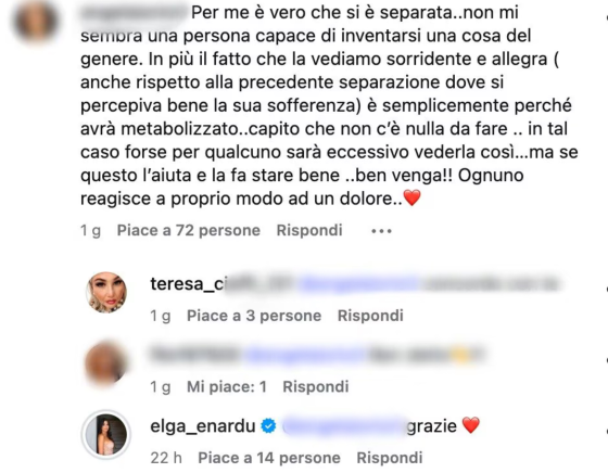 Non tutti però hanno creduto alla veridicità della parole della Enardu e l’hanno accusata di stare fingendo la rottura con il marito solo per attirare l’attenzione e far parlare di loro. Dure insinuazioni, queste, a cui Elga ha deciso di rispondere replicando al commento di una persona che l’ha difesa da queste accuse: