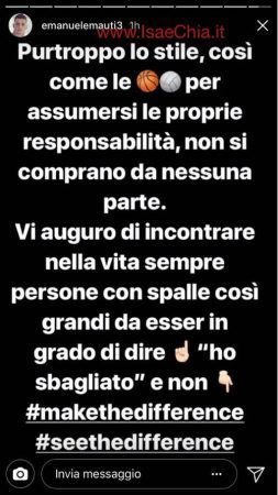 A quanto pare le dichiarazioni della Lorenzini non sono andate particolarmente a genio a Emanuele che pochi istanti fa tramite un’Instagram Story ha risposto così all’ex fidanzata: ‘Purtroppo lo stile, così come le palle per assumersi le proprie responsabilità, non si comprano da nessuna parte. Vi auguro di incontrare sempre persone con le spalle così grandi da esser in grado di dire ‘Ho sbagliato’ e non #makethedifference, #seethedifference!’.
