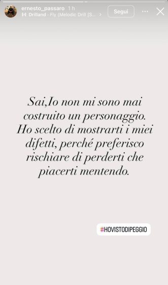 Proprio dopo questi avvenimenti, sul profilo Instagram di Ernesto è apparso un criptico messaggio, che in molti sui social hanno interpretato come una frecciatina al suo rivale:
