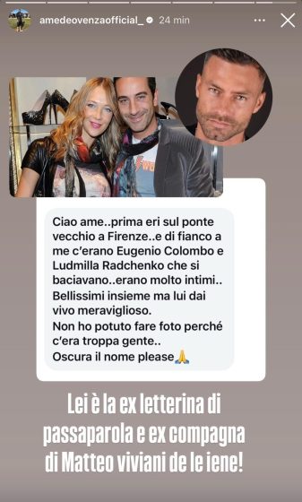 Ciao Ame prima ero sul ponte vecchio a Firenze e di fianco a me c’erano Eugenio Colombo e Ludmilla Radchenko che si baciavano erano molto intimi. Bellissimi insieme ma lui dai vivo meraviglioso. Non ho potuto fare foto perché c’era troppa gente.