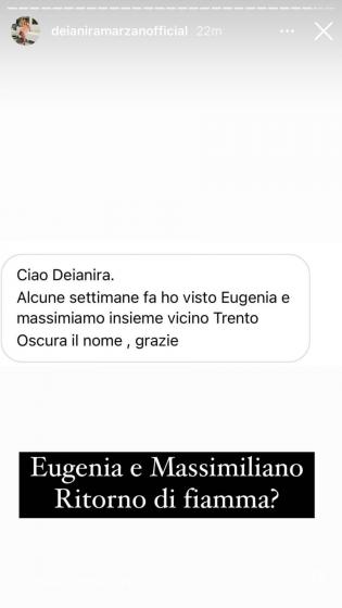 E’ stata una segnalazione di Deianira Marzano a mettere una pulce nell’orecchio a tanti appassionati del Trono Classico, riportando ciò che le ha scritto in privato una sua utente. Quest’ultima, infatti, sostiene di aver visto Eugenia e Massimiliano vicino Trento, insieme.