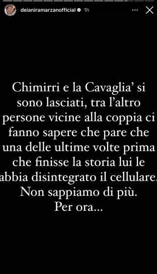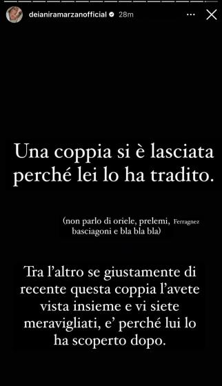 Nonostante fosse una coppia che aveva già vissuto alti e bassi la notizia della rottura è stata inaspettata. A confermarla, secondo molti, l’indiscrezione che questa mattina Deianira Marzano ha condiviso sul suo profilo Instagram. Si tratta di un pettegolezzo, che però non è associato ad alcun nome e ad alcun volto:
