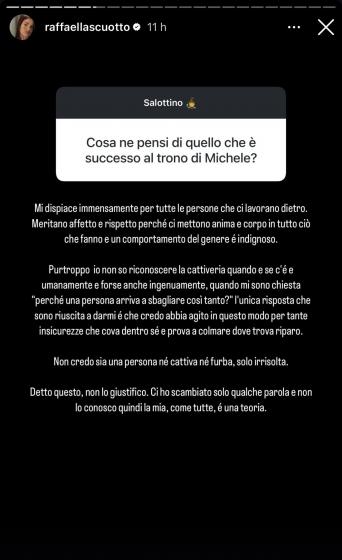 Dopo aver eliminato la sua corteggiatrice Mary Chiaro, lei ha scelto di vuotare il sacco raccontando tutta la verità. Michele, servendosi di un profilo falso, si era messo in contatto con lei e con le altre sue corteggiatrici, dando vita ad un vero e proprio “trono nel trono”.
