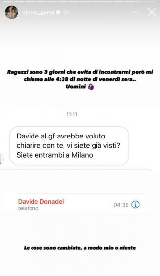 Uomini e Donne, i fan chiedono a Chiara Rabbi se abbia visto Davide Donadei dopo la sua uscita dal Gf Vip 7: lei risponde pubblicando uno screen