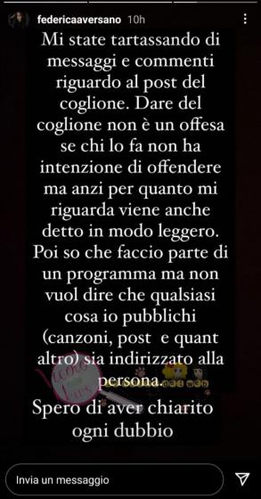 In molti hanno pensato che con quelle parole Federica si volesse riferire proprio a Matteo. Per questo la corteggiatrice è intervenuta con una storia, pubblicata da ilvicolodellenews.it, che poi ha subito rimosso: