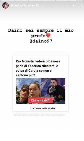 Federica Aversano, anche lei sul trono accanto ai due Fede e a Lavinia Mauro, ha evidentemente letto l’intervista di Dainese, considerato il gesto social che non è passato affatto inosservato al popolo del web.