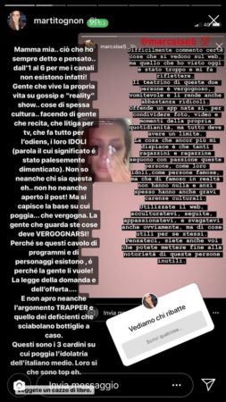Dall’1 al 6 per me i canali non esistono. C’è gente che vive la propria vita basandola sul gossip e sui reality show, cose di cultura, facendo di gente che recita, che litiga in tv e che fa di tutto per l’audience i loro idoli. Non so neanche chi sia questa (la Fiordelisi che appare nella Instagram story mentre piange, ndr) perché non ho neanche aperto il post, ma si capisce la base su cui si poggia.. che vergogna. La gente che guarda queste cose deve vergognarsi perché se questi cavolo di programmi e di personaggi esistono è perché la gente li vuole.