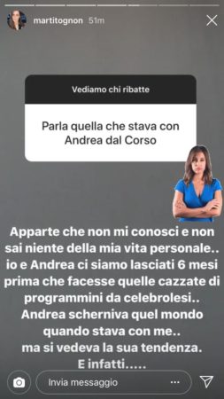 A dire la sua sulla vicenda infatti non si è tirata indietro nemmeno Martina Tognon, modella e attrice ma soprattutto ex fidanzata di Andrea Dal Corso, che attraverso una Instagram story ha tuonato contro questo genere di programmi e di personaggi televisivi dicendo: