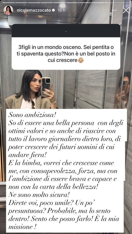 Poi Nicole Mazzocato ha anche risposto ad un altro utente che le sottolineava come il mondo di oggi faccia particolarmente paura, soprattutto per procreare bimbi: