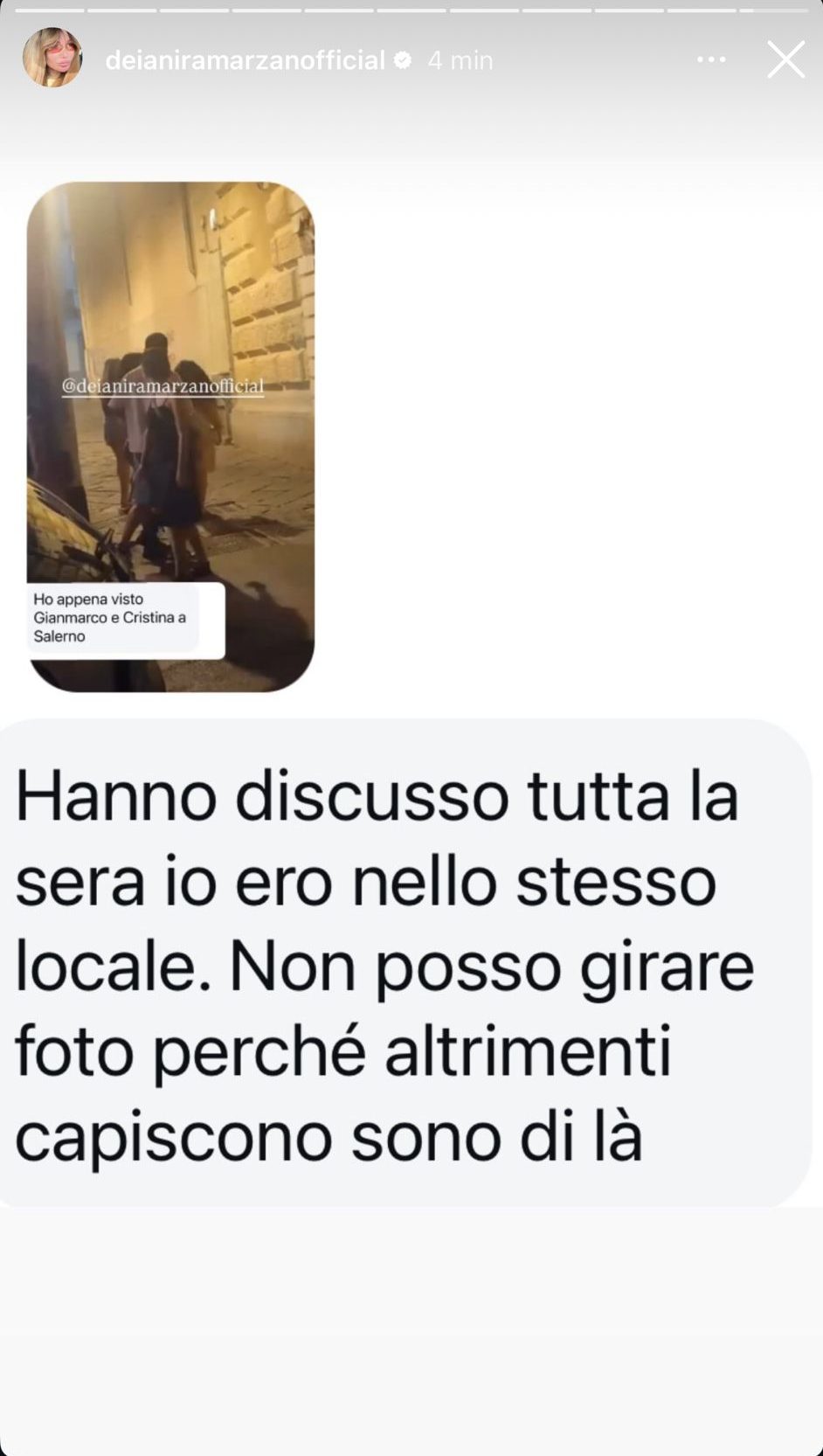 Ma i rumor di crisi non si fermano e proprio di recente una nuova segnalazione è arrivata a Deianira Marzano: Gianmarco e Cristina sono stati avvistati insieme a Salerno ma non sarebbero in buoni rapporti: