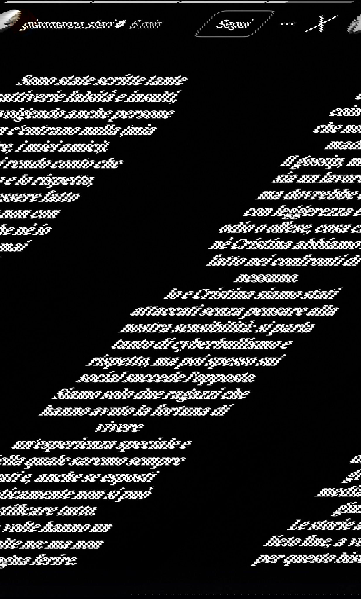 Sono state scritte tante cattiverie falsità e insulti, coinvolgendo anche persone che non c’entrano nulla (mia madre, i miei amici). Il gossip, mi rendo conto che sia un lavoro e lo rispetto, ma dovrebbe essere fatto con leggerezza e non con odio o offese, cosa che né io né cristina abbiamo mai fatto nei confronti di nessuno. Io e Cristina siamo stati attaccati senza pensare alla nostra sensibilità: si parla tanto di cyberbullismo e rispetto, ma poi spesso sui social succede l’opposto.
